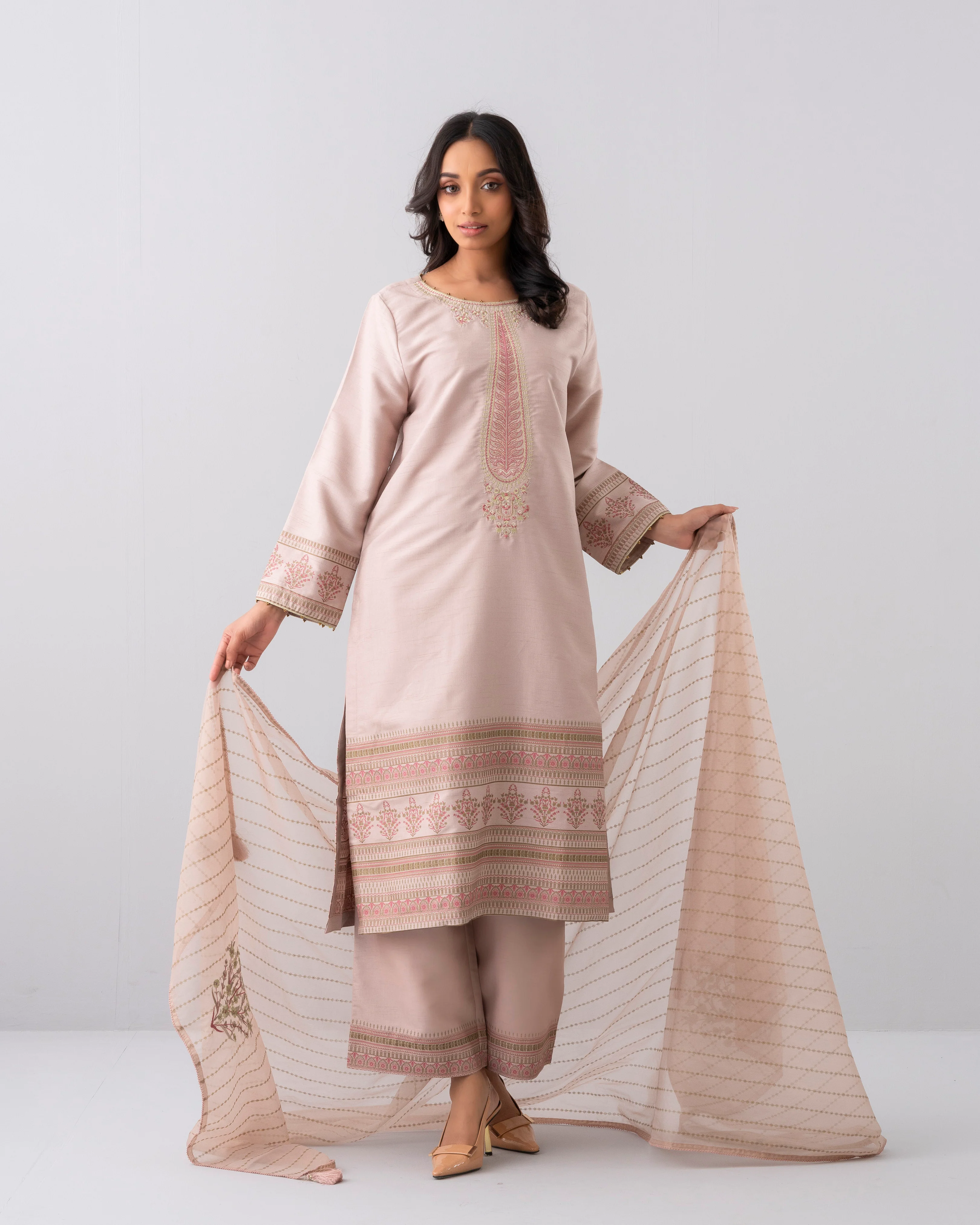 Smart Fit Embroidered Three-Piece Semi-Formal Ethnic Set with Organza Dupatta